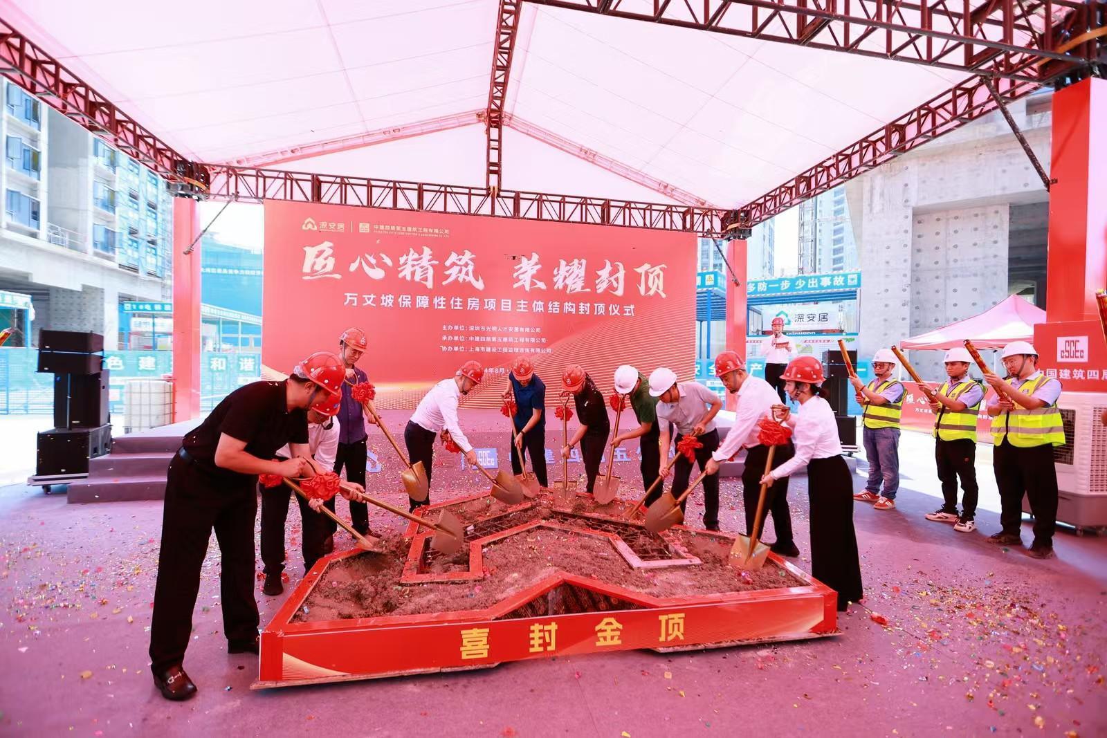 封顶仪式上,嘉宾们金铲齐开,扬起沃土。伴随着响亮的鞭炮声,万丈坡保障性住房项目主体结构封顶仪式圆满礼成。